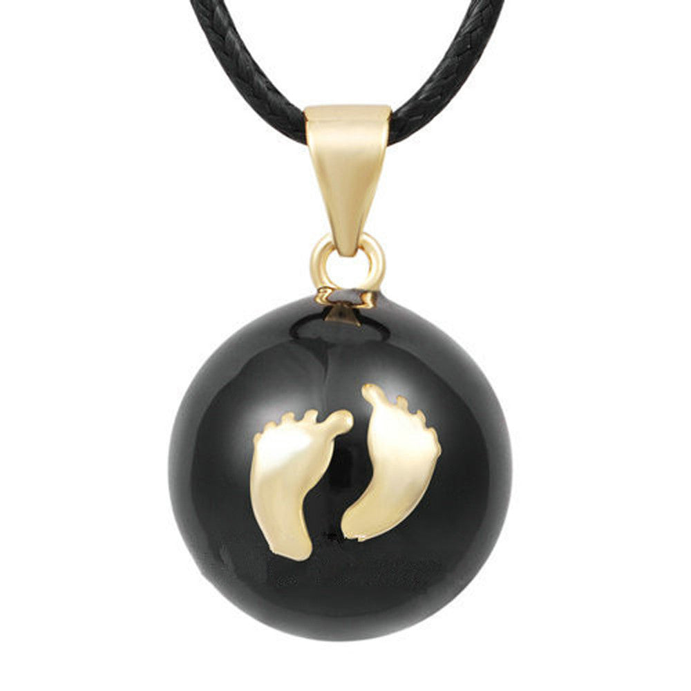 Our "Baby Feet" necklace features a black ball with small golden baby feet stamped into the chime ball.